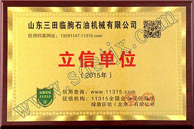 2016年1月16日上午,臨朐縣中小企業(yè)辦公室、臨朐縣政務服務中心和臨朐縣綠盾征信有限公司在廣華鋁材會議室聯(lián)合舉辦臨朐縣第一批立信單位授牌儀式,會議為300余家優(yōu)秀企業(yè)進行了立信授牌,山東三田臨朐石油機械有限公司作為代表上臺領取了立信單位牌匾。